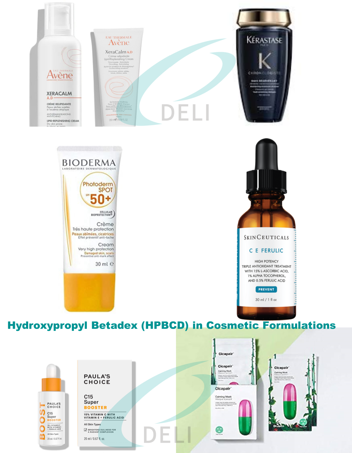 सध्या, बरेच कॉस्मेटिक आणि स्किन केअर ब्रँड त्यांच्या फॉर्म्युलेशनमध्ये वापरल्या जाणार्या विशिष्ट घटक (उदा. हायड्रोक्सीप्रॉपिल बिटासीक्लोडेक्स्ट्रिन, एचपीबीसीडी) सविस्तरपणे उघड करीत नाहीत, ज्यामुळे एचपीबीसीडी वापरणार्या सर्व विशिष्ट उत्पादनांची निश्चितपणे यादी करणे अधिक कठीण होते. तथापि, सार्वजनिकपणे उपलब्ध साहित्य, पेटंट्स आणि उद्योग स्त्रोतांच्या आधारे, खाली काही स्पष्टपणे किंवा अत्यंत संभाव्य श्रेणी आणि सौंदर्यप्रसाधने आणि एचपीबीसीडी वापरणार्या त्वचेची देखभाल उत्पादनांची उदाहरणे आहेत: