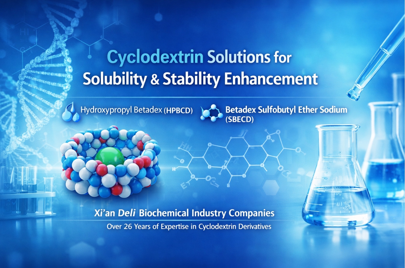 1999 मध्ये स्थापित, Xi'an Deli बायोकेमिकल इंडस्ट्री कंपन्या ही सायक्लोडेक्स्ट्रिन डेरिव्हेटिव्हची एक विशेष उत्पादक आहे, जी जागतिक ग्राहकांना हायड्रॉक्सीप्रोपाइल बीटाडेक्स (HPBCD) आणि बीटाडेक्स सल्फोब्युटाइल इथर सोडियम (SBECD) पुरवते. उत्पादनाची सुसंगतता, स्पष्ट वैशिष्ट्ये आणि व्यावहारिक तांत्रिक समर्थन यावर दीर्घकाळ लक्ष केंद्रित करून, कंपनी विश्वसनीय सायक्लोडेक्स्ट्रिन-आधारित उपाय प्रदान करण्यासाठी वचनबद्ध आहे.
