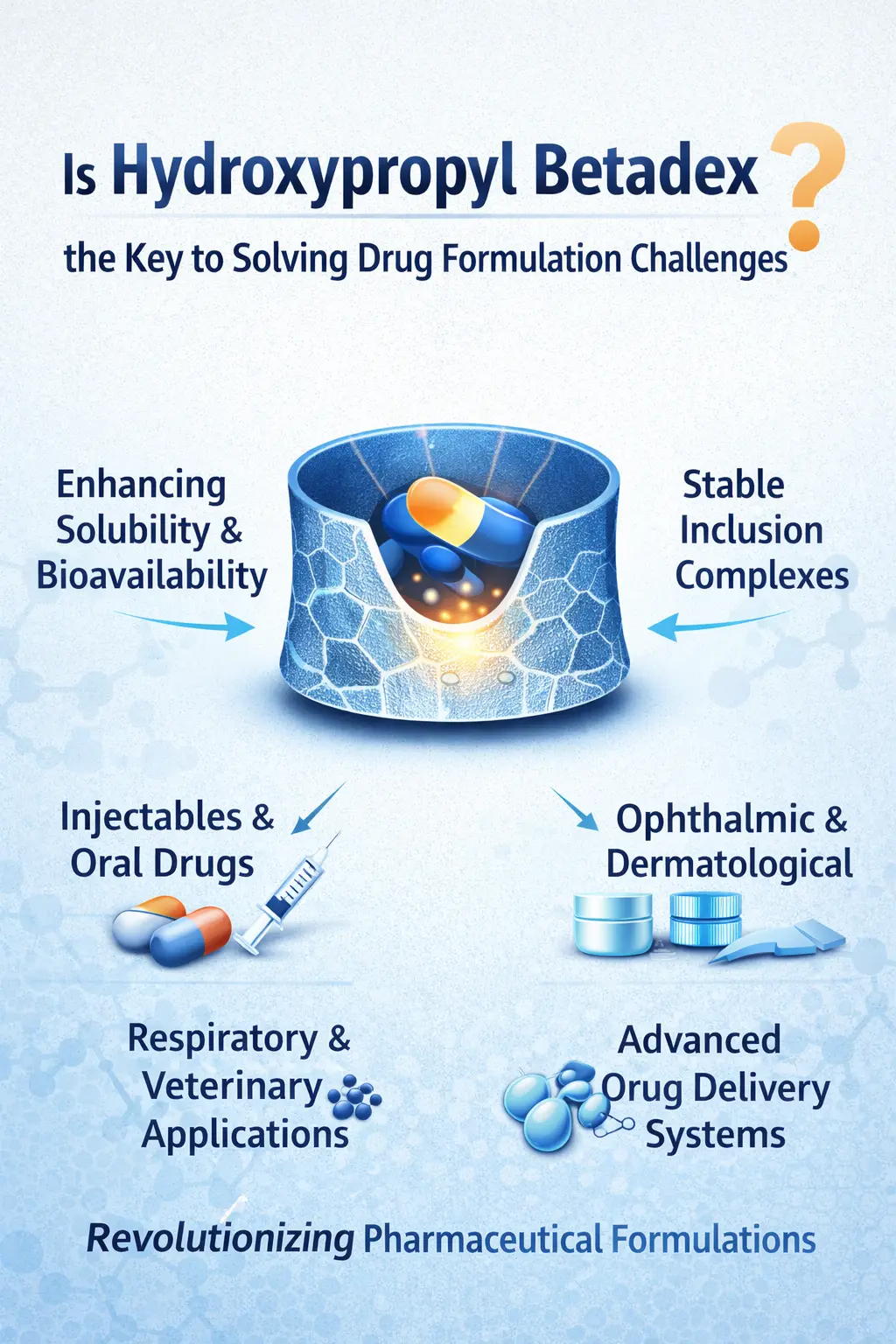 इंजेक्शन करण्यायोग्य औषधांमध्ये औषध विद्राव्यता आणि सुरक्षिततेच्या समस्या सामान्य आहेत.हायड्रॉक्सीप्रोपील बीटाडेक्सस्थिर समावेशन कॉम्प्लेक्स तयार करून या समस्यांचे निराकरण करते जे औषध साठवून ठेवत असताना त्याची शुद्धता ठेवते. रसायनामुळे पूर्वी त्रासदायक असलेल्या पदार्थांना स्पष्ट, सुरक्षित द्रव द्रावणात बदलणे शक्य होते.