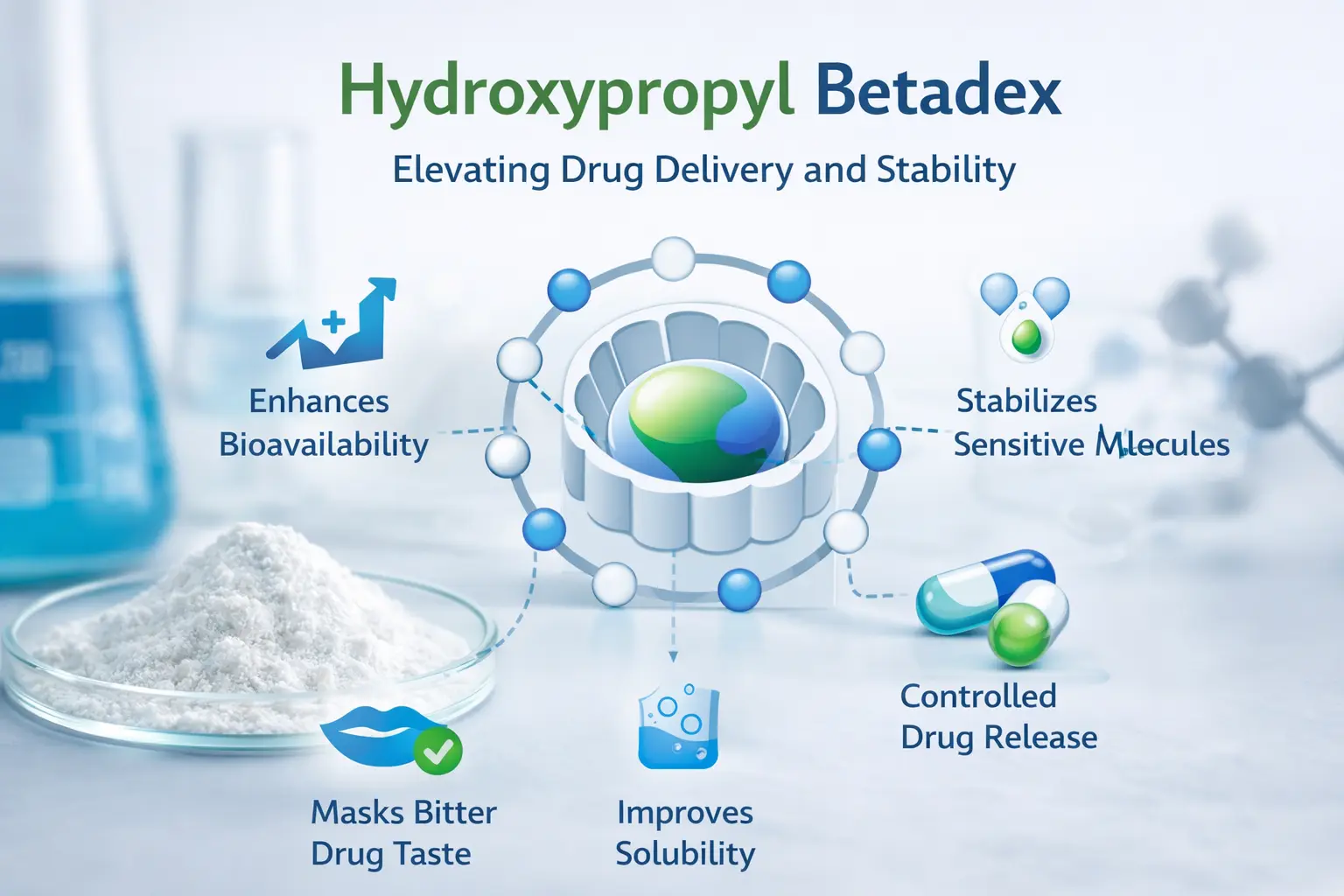 नियंत्रित प्रकाशनासह, फॉर्म्युलेटर क्लिष्ट वितरण पद्धती वापरल्याशिवाय औषधे कशी सोडली जातात हे बदलू शकतात. Hydroxypropyl Betadex, अतिथी रेणू यजमान रेणूशी झटपट, शाश्वत किंवा लक्ष्यित रिलीझ पॅटर्न मिळवण्यासाठी कसा संवाद साधतो ते बदलू शकते. ही अष्टपैलुत्व नवीन औषधे तयार करण्यासाठी लागणारा वेळ कमी करते आणि रुग्णांना त्यांच्या डोस योजनांचे अनुसरण करणे सोपे करते, ज्यामुळे अनुपालन सुधारते.