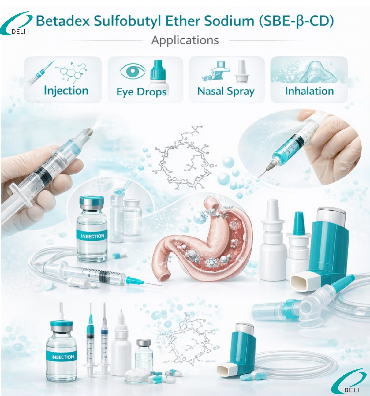 इंजेक्शन करण्यायोग्य औषधांच्या विकासामध्ये, सल्फोब्युटिल इथर बीटा सायक्लोडेक्स्ट्रिन सोडियमचा वापर औषध विघटन सुधारण्यासाठी, विरघळल्यानंतर होणारा वर्षाव टाळण्यासाठी आणि एकूण फॉर्म्युलेशन स्थिरता वाढविण्यासाठी केला जातो. हे इंजेक्शन साइटवर स्थानिक चिडचिड कमी करून रुग्णाची सहनशीलता सुधारण्यास देखील योगदान देते.